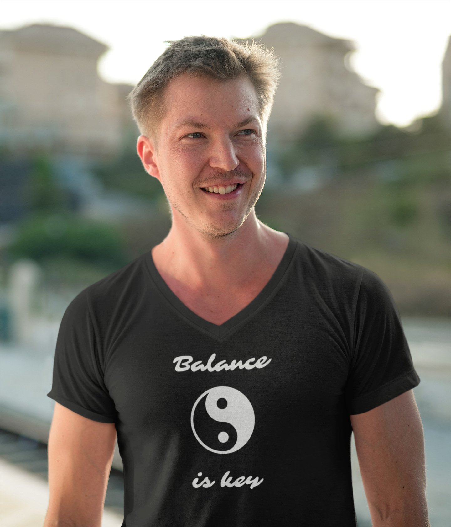- Our inspiring “Balance is Key” V-neck T-shirt with a yin-yang.